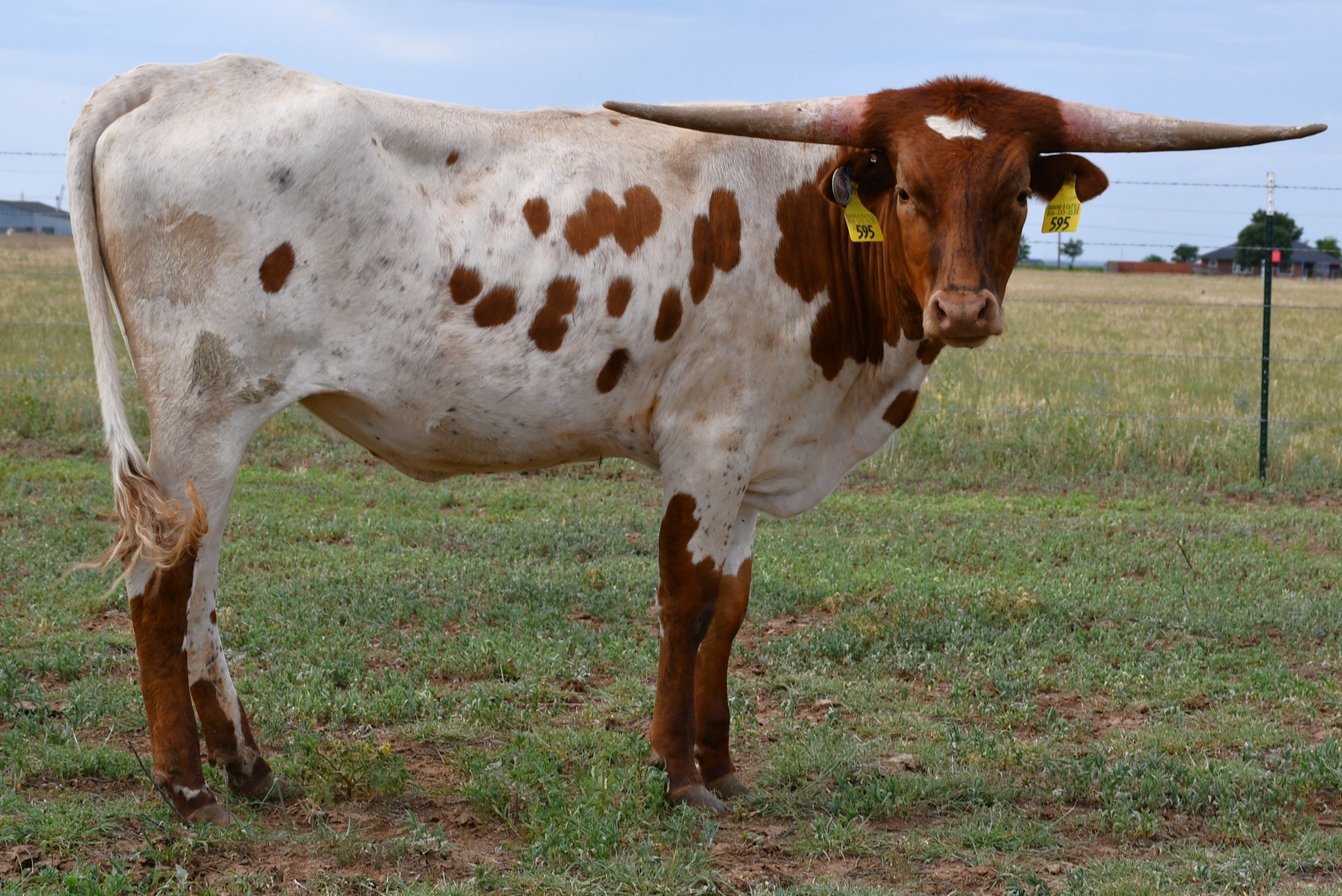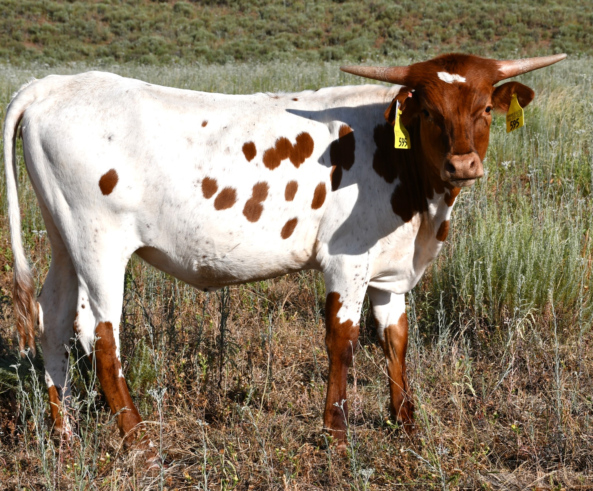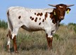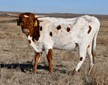 Nice young heifer with the world ahead of her. Made it to upper 50's at 24 months with her tips angled slightly back. Red and white with black stripes coming in strong. Confirmed 3 months bred to DB Magnificent.