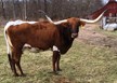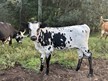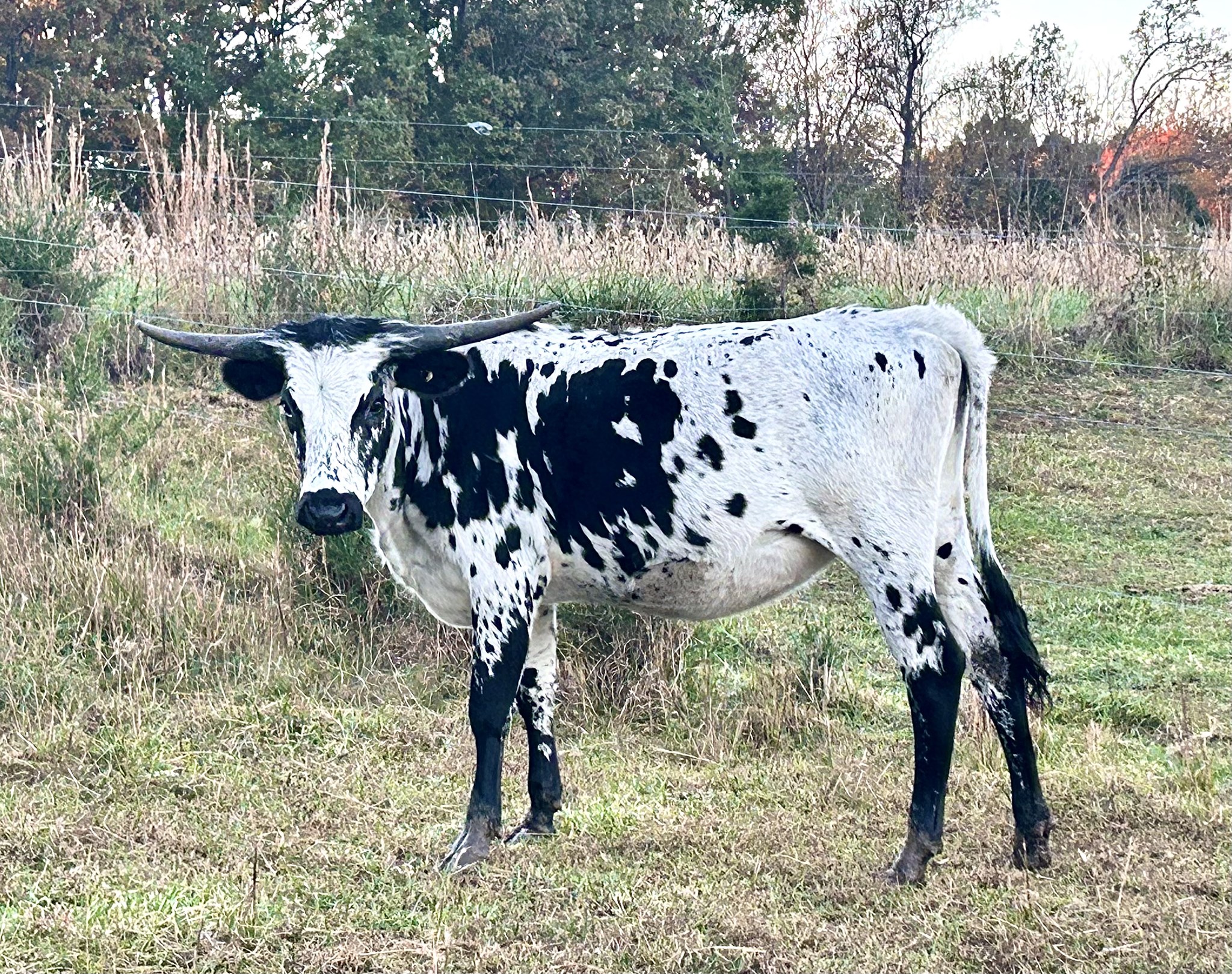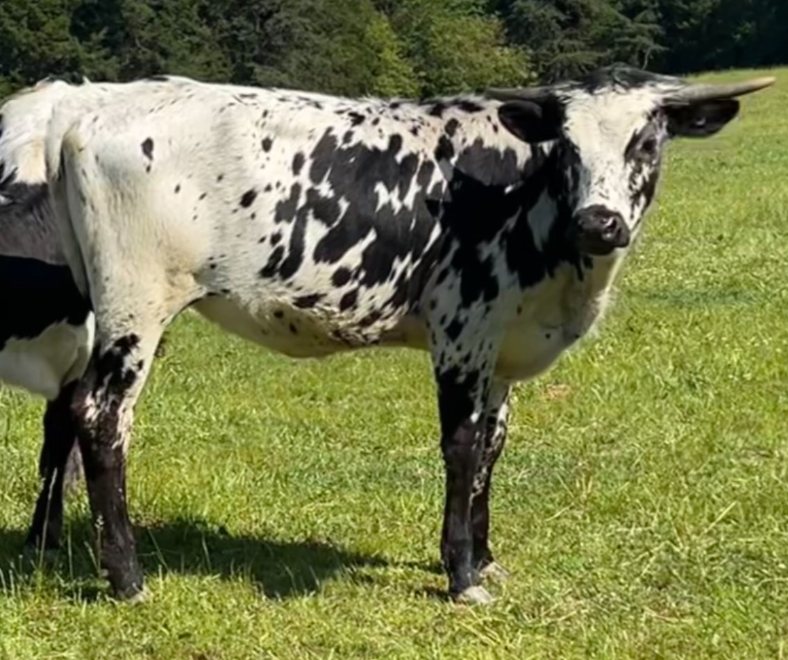 Beautiful black & white heifer with a lace face. We are very excited about this little girl and can't wait to see how she develops! All black horn so far. Exposed to M7 Pacific Dusty for a early spring 2026 calf.