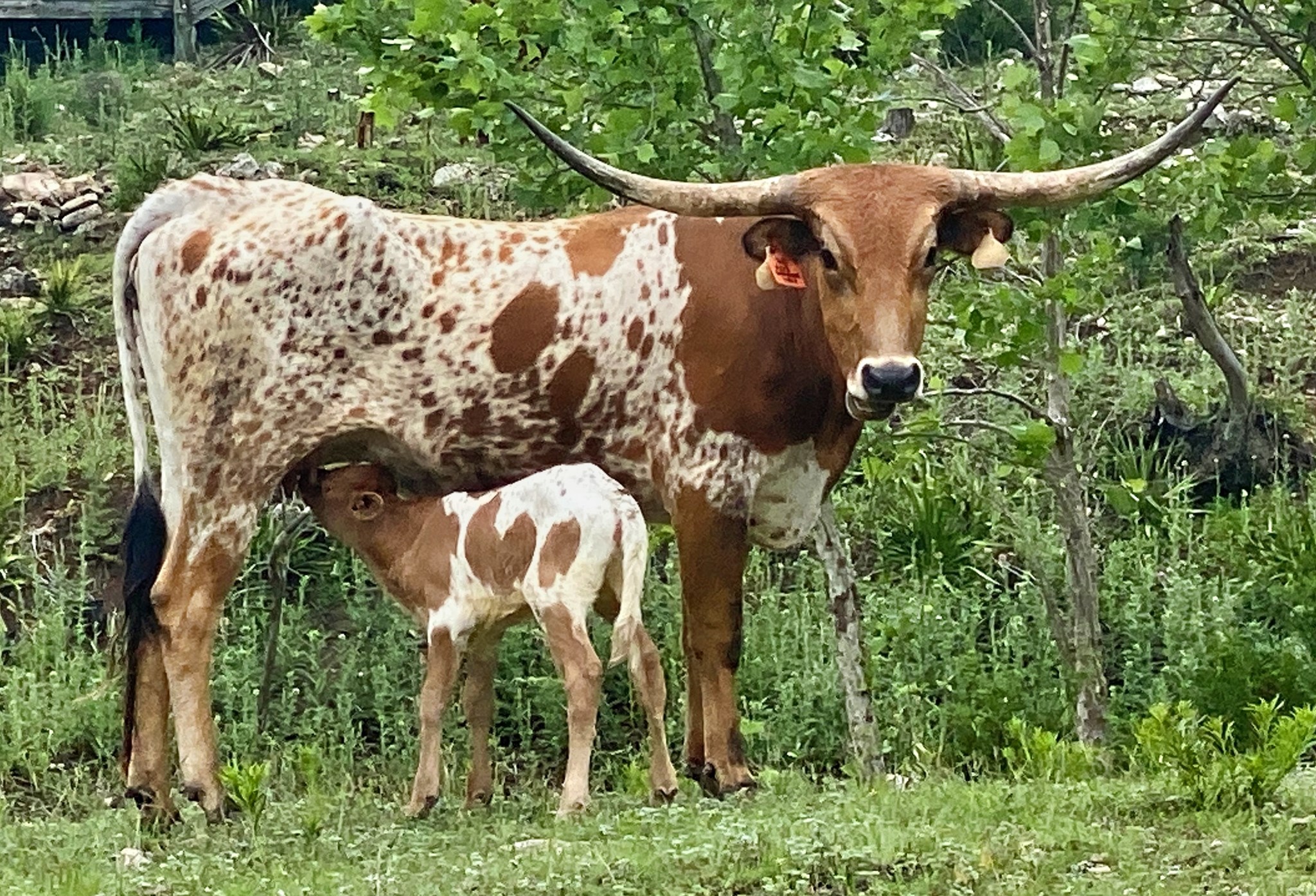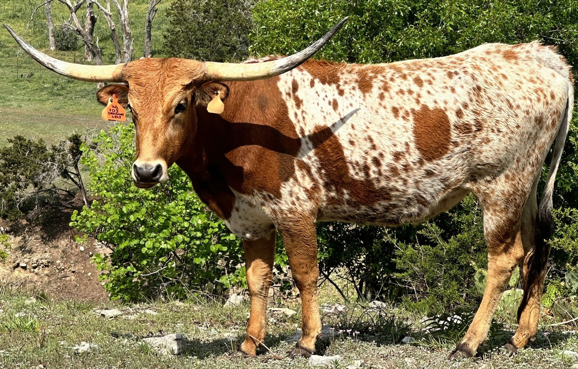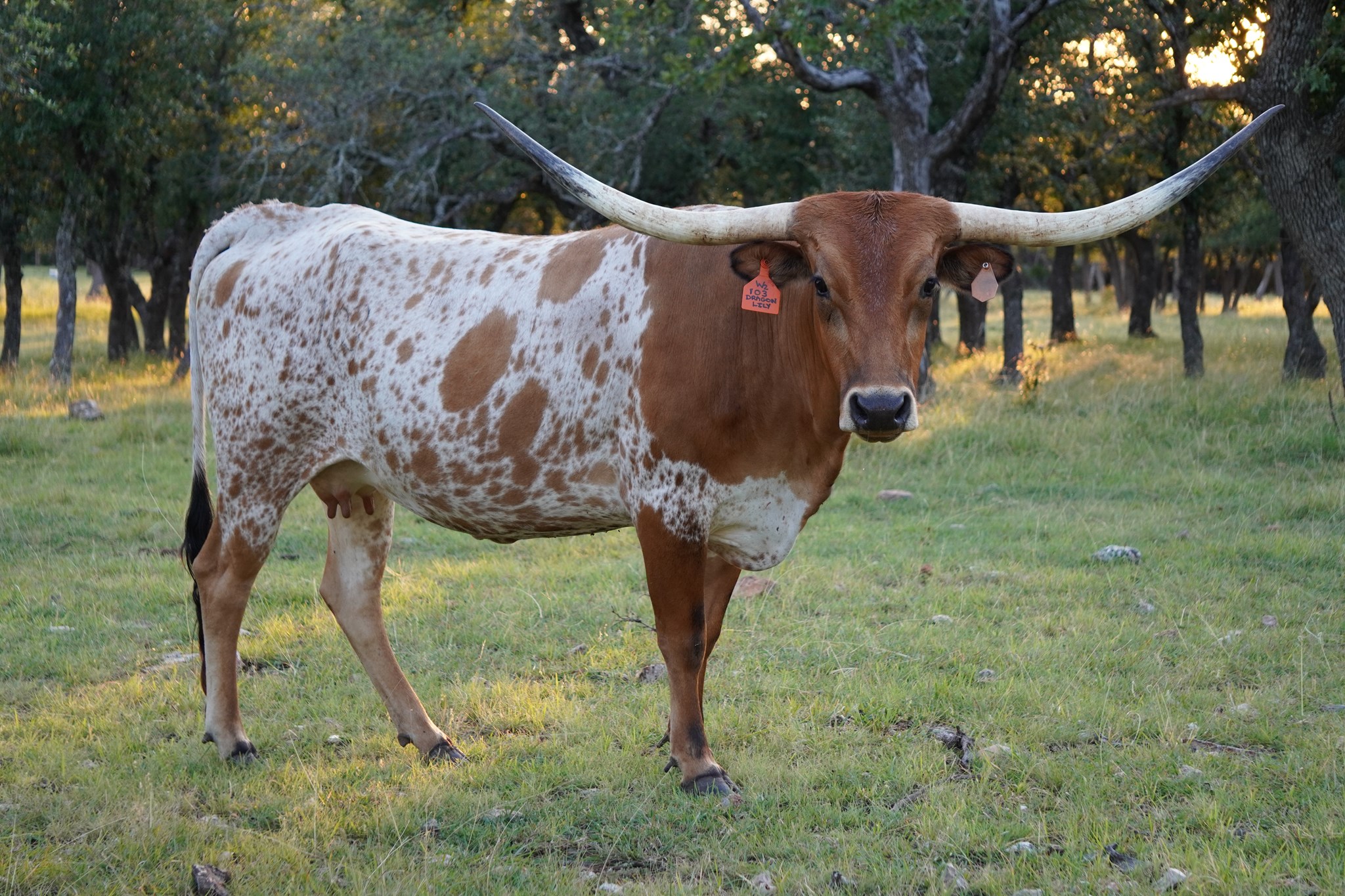 She was included in our purchase of G & P Longhorns in 2021 as a very young heifer calf. She is sired by Drag Iron and was the first cow to rock the W2 brand. While not the biggest horned/framed cow, she is a producer, having given us 3 straight heifers!