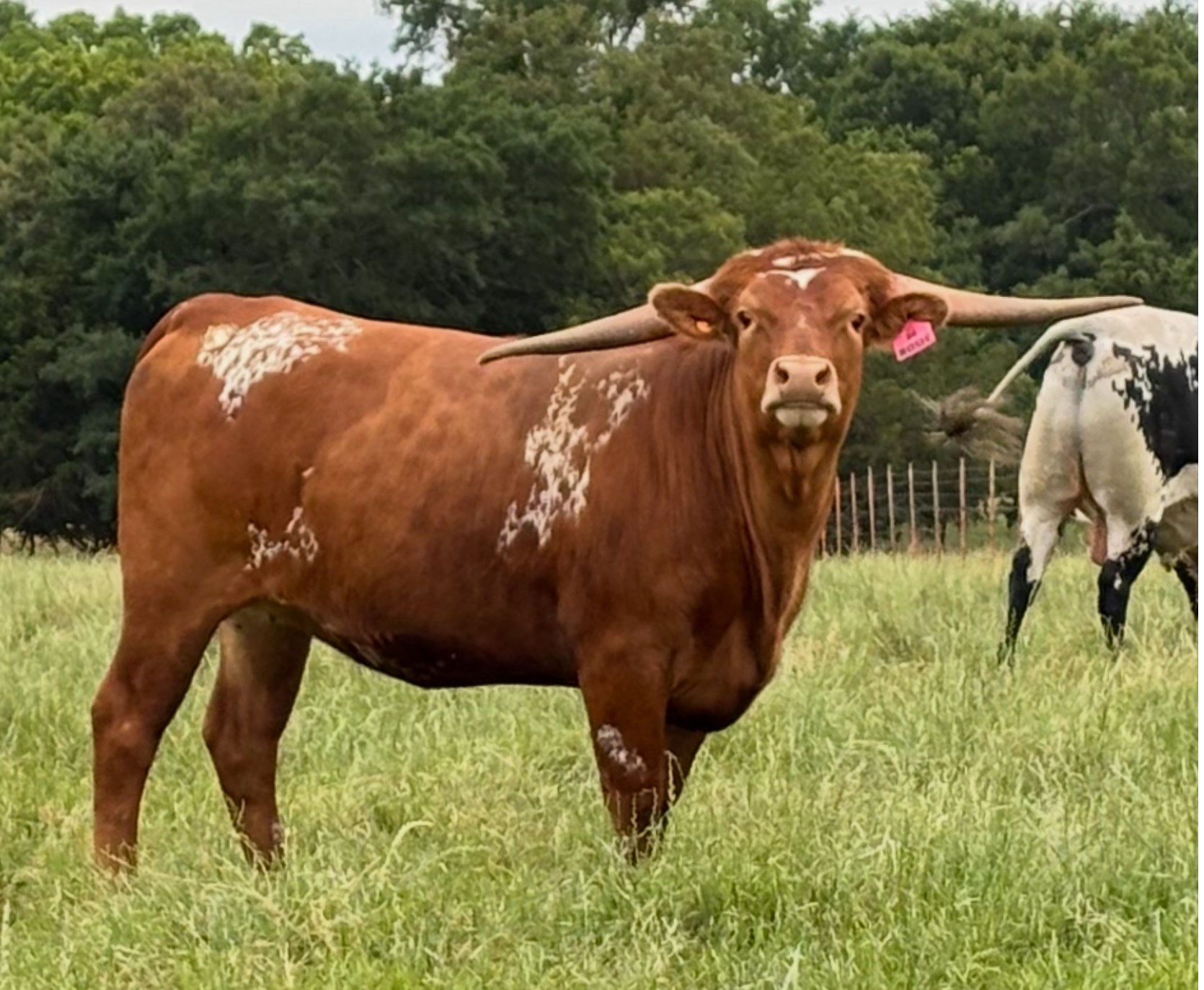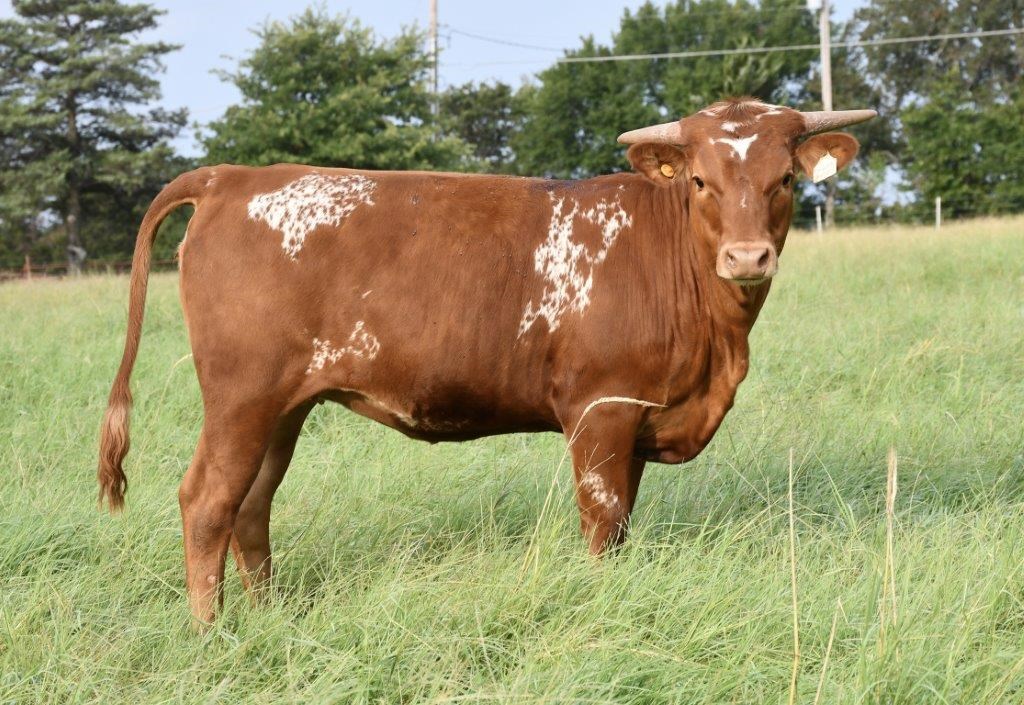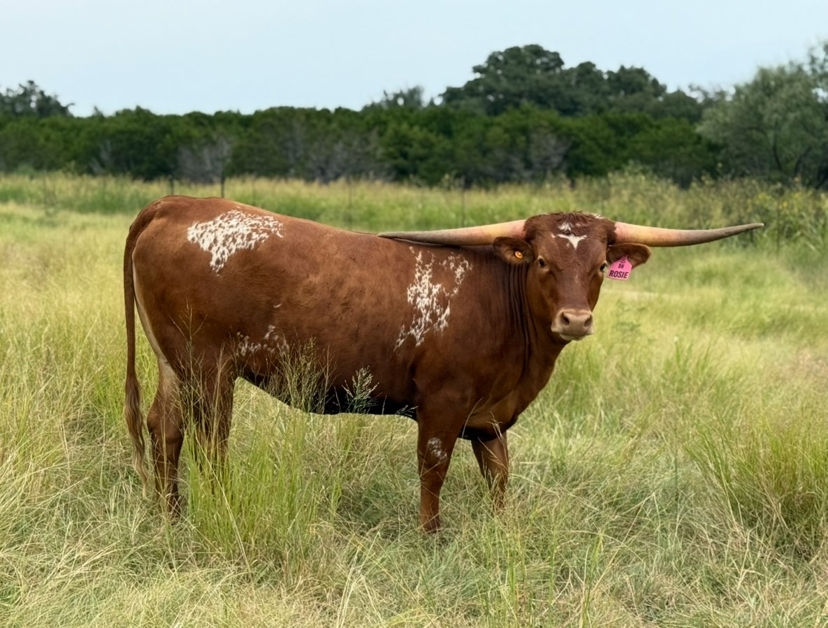DH Rosie is a young heifer with tremendous promise, carrying a pedigree that blends some of the best-producing genetics in the Texas Longhorn breed. Bred by Dale Hunt and proudly owned by Buxton Longhorns, Rosie traces back to powerhouse sires and dams known for consistency, horn growth, and refinement. Her futurity championship sire, DH Hired Hand, brings the influence of HL Higher Ground (a WS Vindicator son out of Horseshoe J Important) and DH Rough Start, a daughter of Voodoo Cowboy — both contributing depth of frame and striking color genetics. On the maternal side, Rosie comes from DH Dozen Roses, a daughter of Rowdy HR (sire of the 100”+ TTT HR Rebel) and HR Red’s Larisa, blending J.R. Grand Slam and Big Red HR for unmatched horn and maternal power. Rosie’s pedigree is packed with elite producers, yet she carries it with a natural grace and balance. Her deep red coat, straight back, and calm, curious demeanor make her an easy favorite in the pasture.