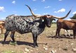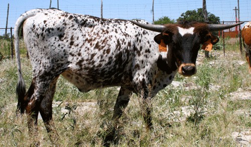 Snow White is a eye opener, with her black and white spots she really stands out. Such a sweetheart! She is big bodied like her dam (Snowy Maid) and sire (Drag Iron). She does have colorful calves. Her big twist in her horns makes her demand attention. She is exposed to The Lone Stranger; a Walkin Tall son out of a Burnin Daylight granddaughter.