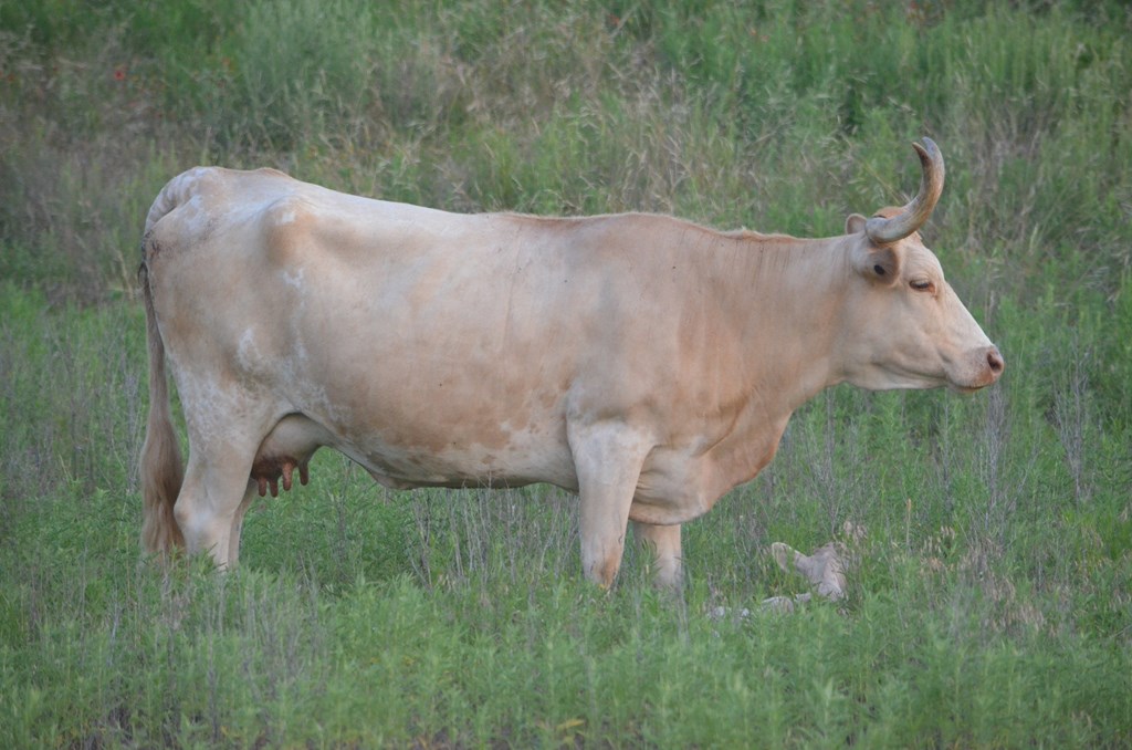 Honey was among our first Texas Longhorns. To learn, we used AI bulls on seedstock. Today most of our cows have more celebrated bloodlines, but Honey never disappoints. She contributes color, calm disposition, milking ability, and thickness.