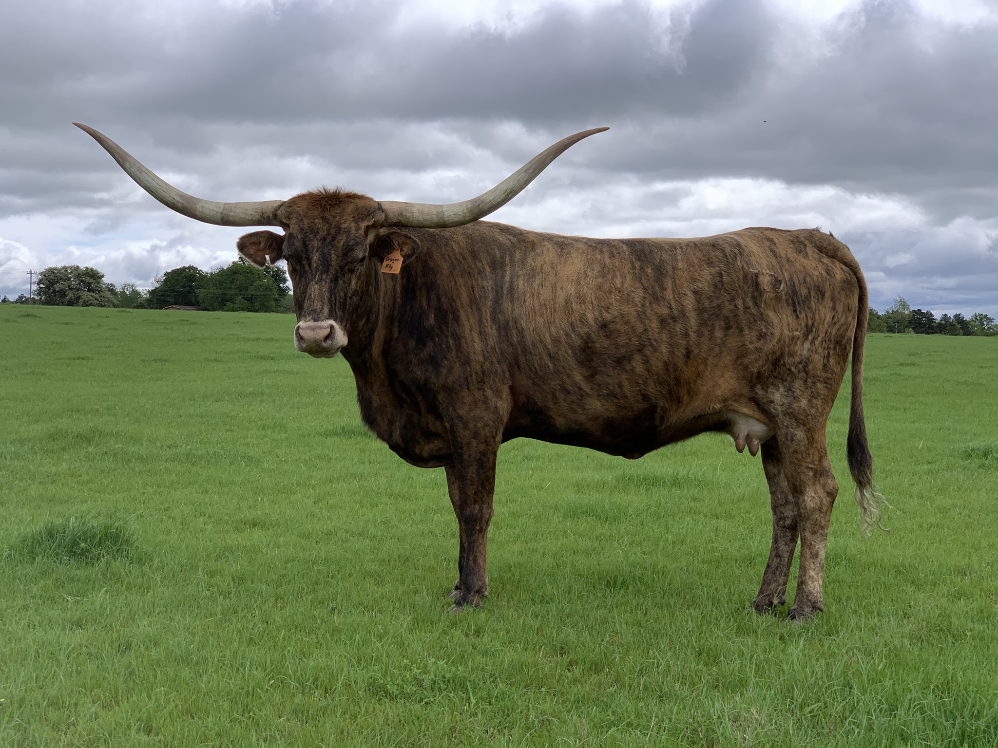 Beautiful bright red brindle, thick body, developing great horns and bases! Sire is the colorful Drag Iron, with 85"TTT horn, son of WS Jamakizm! Dam's pedigree also traces back to WS Jamakizm and ZD Kelly! Dam has unique backwards twist horns!