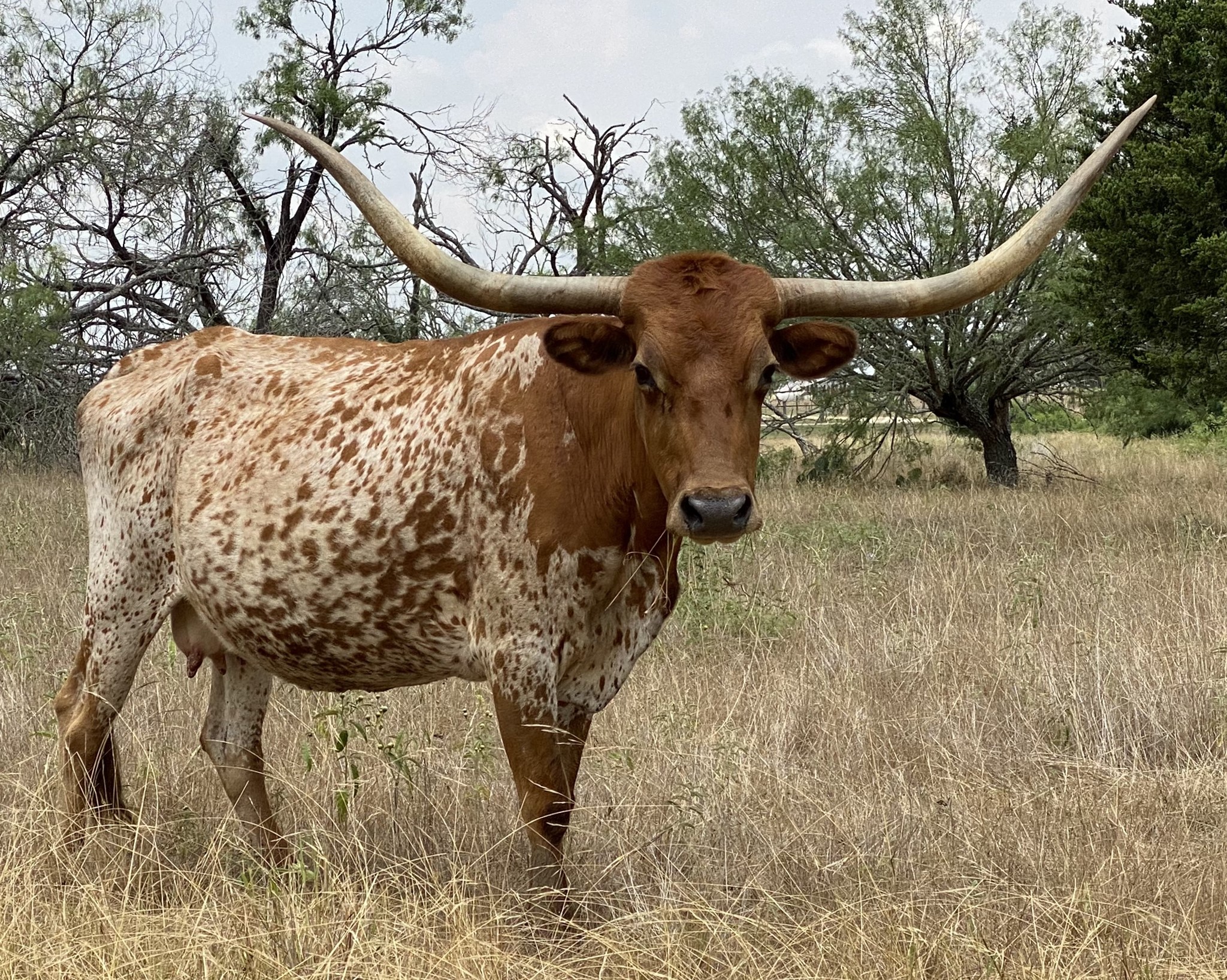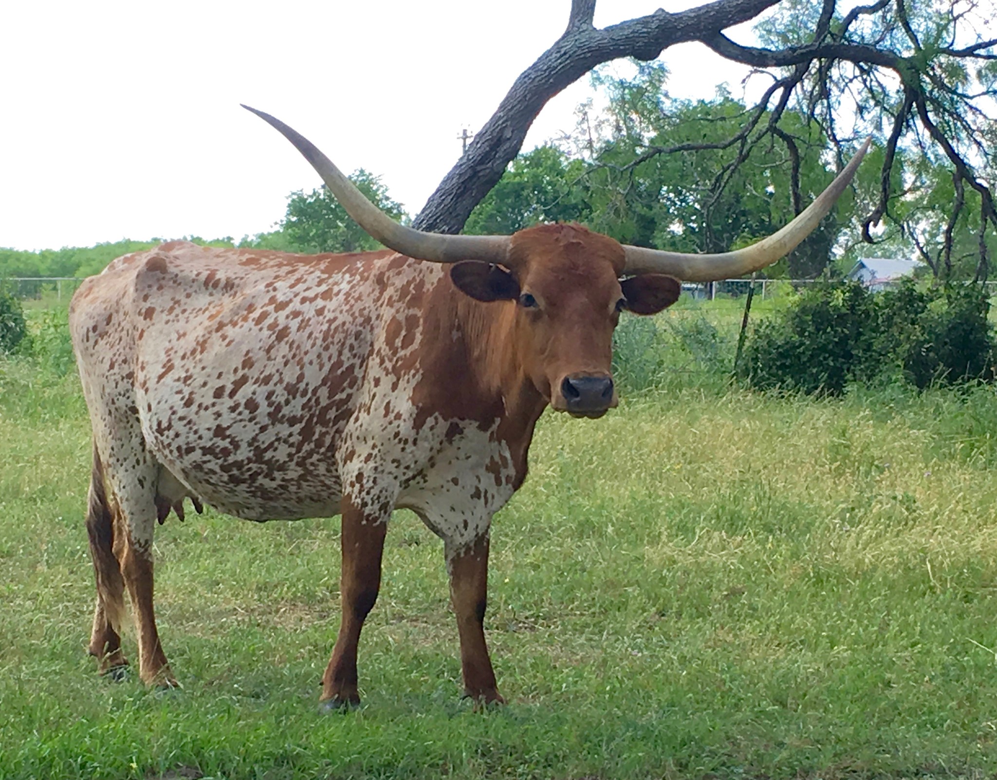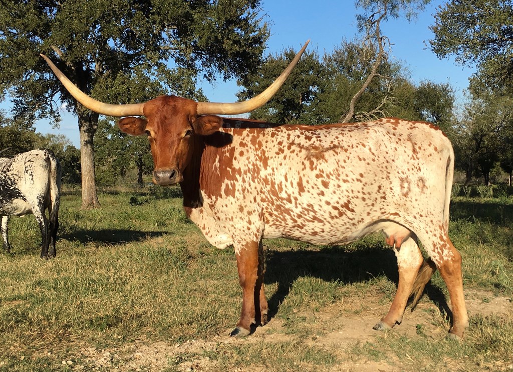 We bought Dreamstreet, Patsy Cline to her friends, from Doreen Hickman, and just like her breeder, she is a Texas sweetheart. Strong pedigree that goes back to The Shadow, top and bottom, which gives her a long, tall frame and great beef conformation. Patsy is a big boned gal and she’s also a spoiled pet, loves getting her head scratched and wont leave you alone until she’s gotten enough. Hell, I think she’d sit in your lap if you’d let her. Beautiful, stout, flashy cow with big sweeping horn that’s rolling out perfectly. Milks like a dairy cow and always raises big correct calves with tons of horn and color. Unlike her namesake, can't sing worth a damn.
