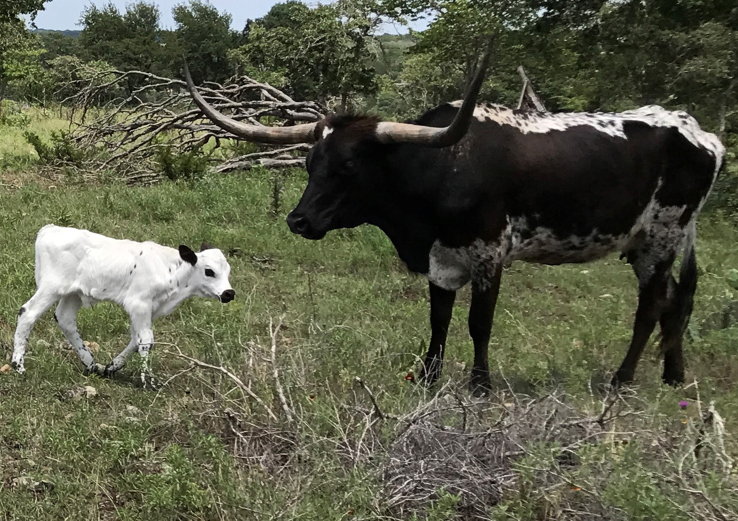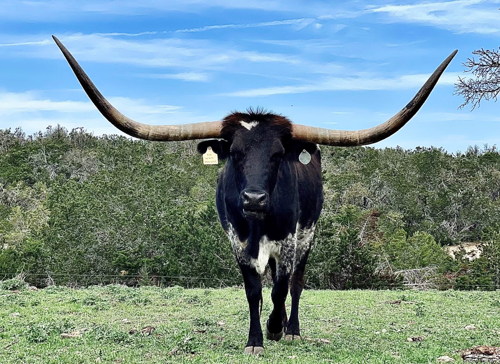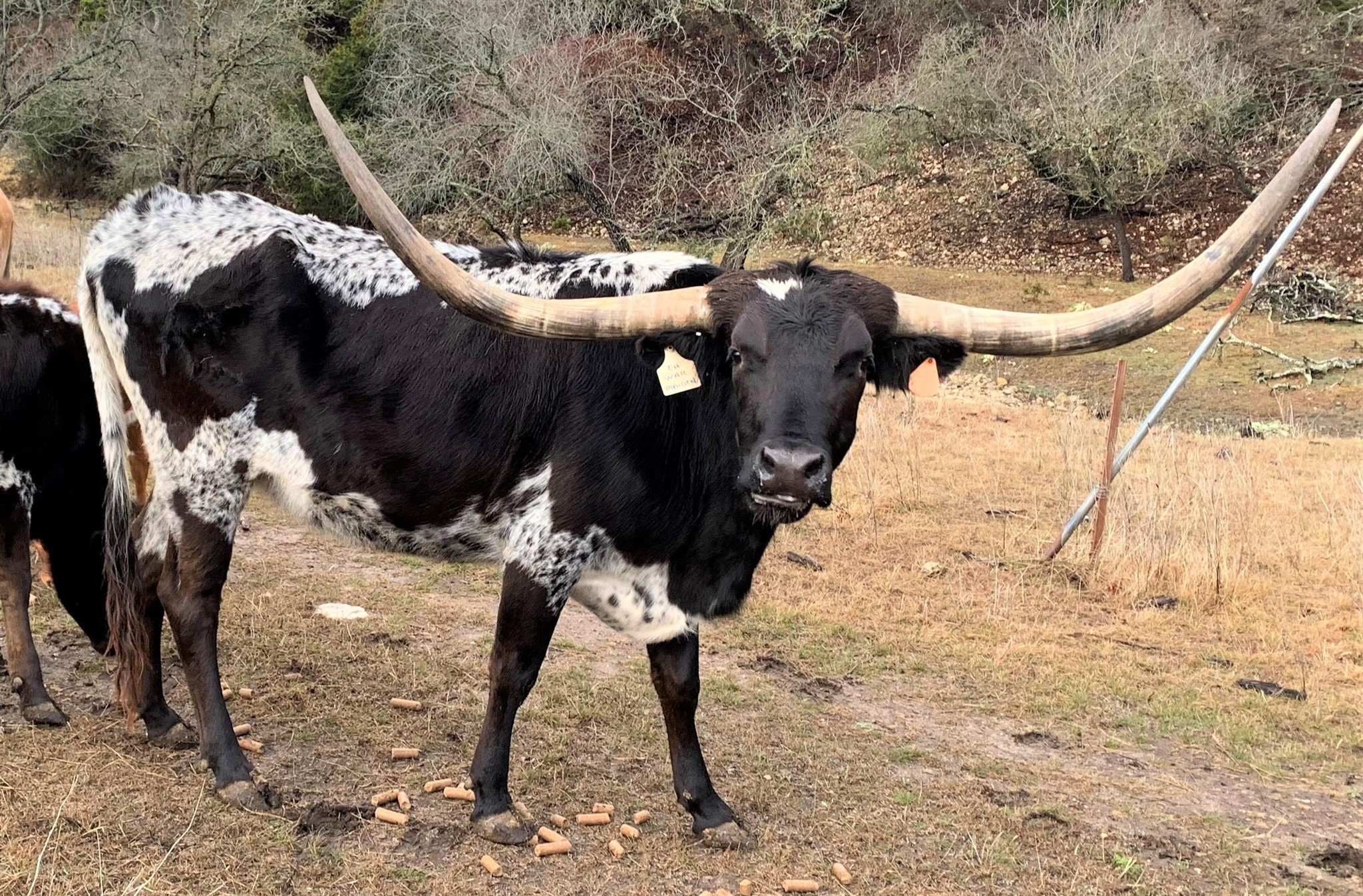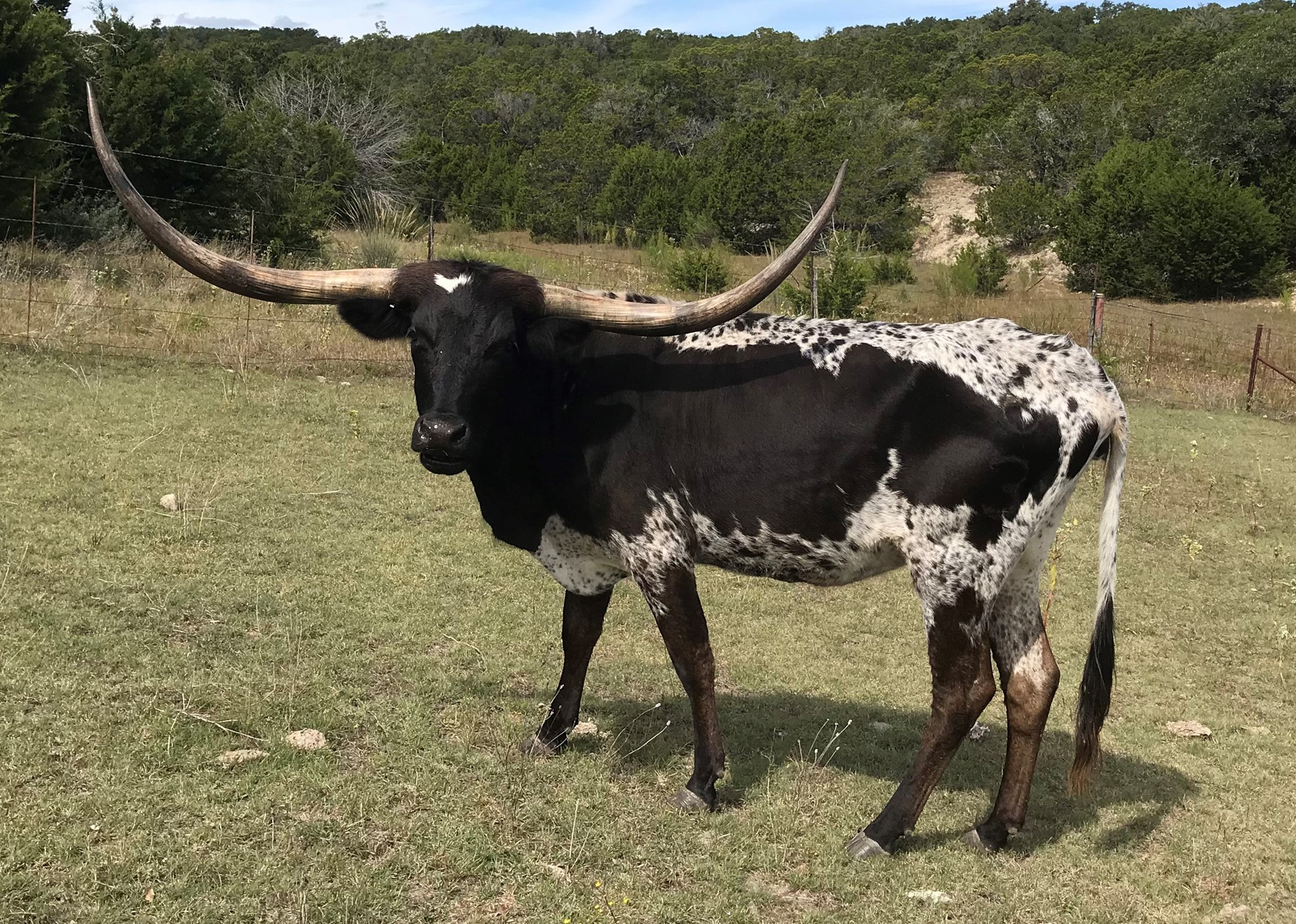 We purchased her from G&P Longhorns in 2021. She is the matriarch of our ranch, being that she is the oldest and the longest tenured resident! She is over 85" TTT with a ton of total horn. To top it off, she only throws true black calves as she is homozygous black (ED/ED). Check out her daughter GP Cut'n Up to give you an idea of what she is capable of producing!