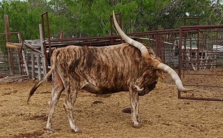 Husband, who's herd is DTL, bought Lacy River on 02/25/2023 at the 2023 Struthoff Ranch Production/Reduction Texas Longhorn Sale. Horns were 79.75 in '23, she'll be over 80" now. Two beautiful brindle heifers from her in two years, due again anytime. Go Lacy!!!