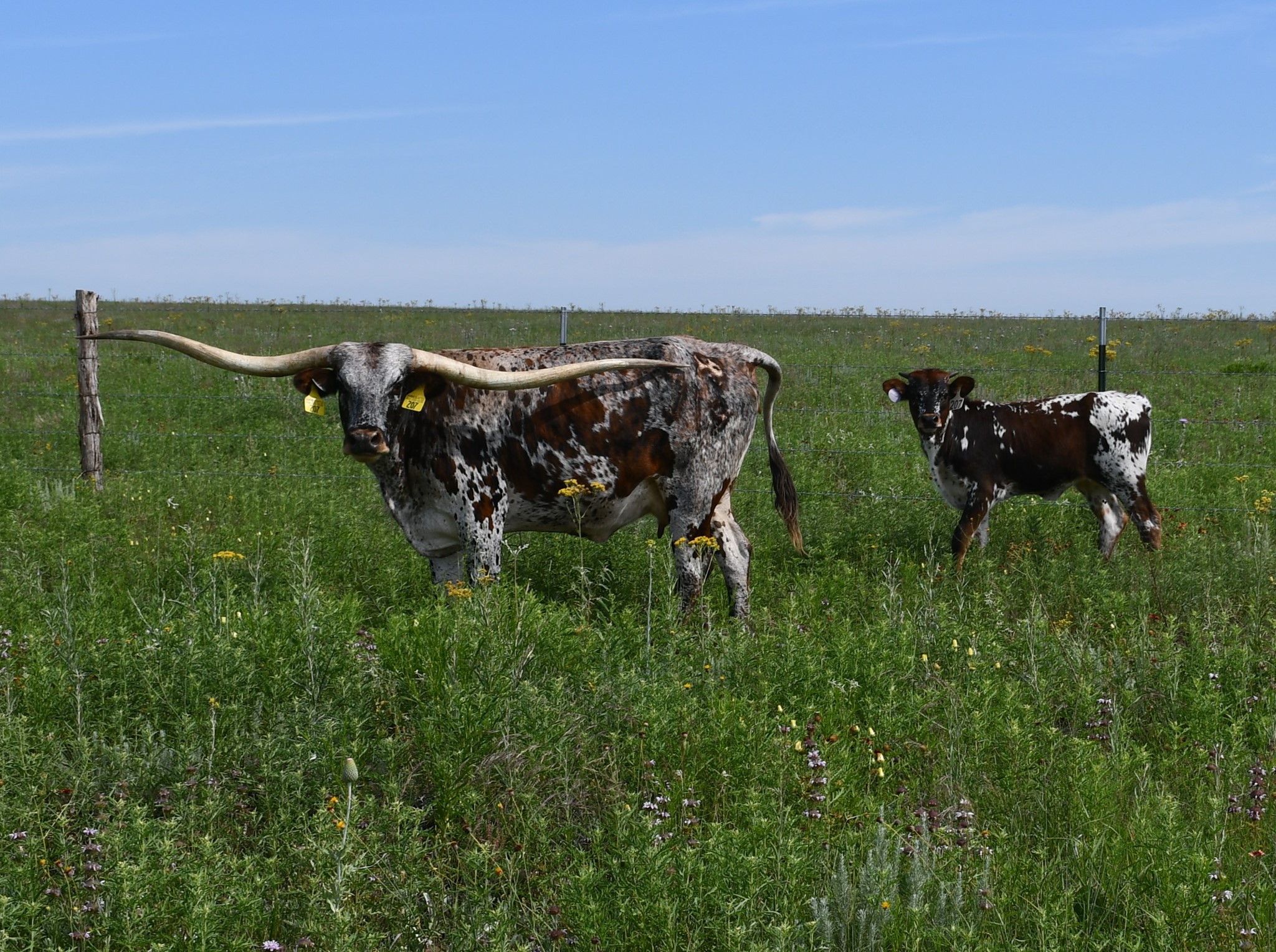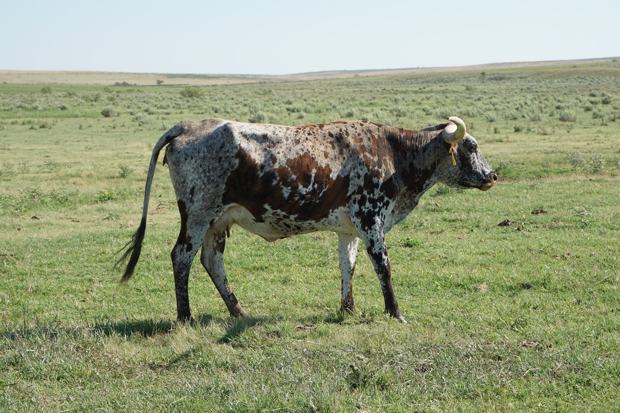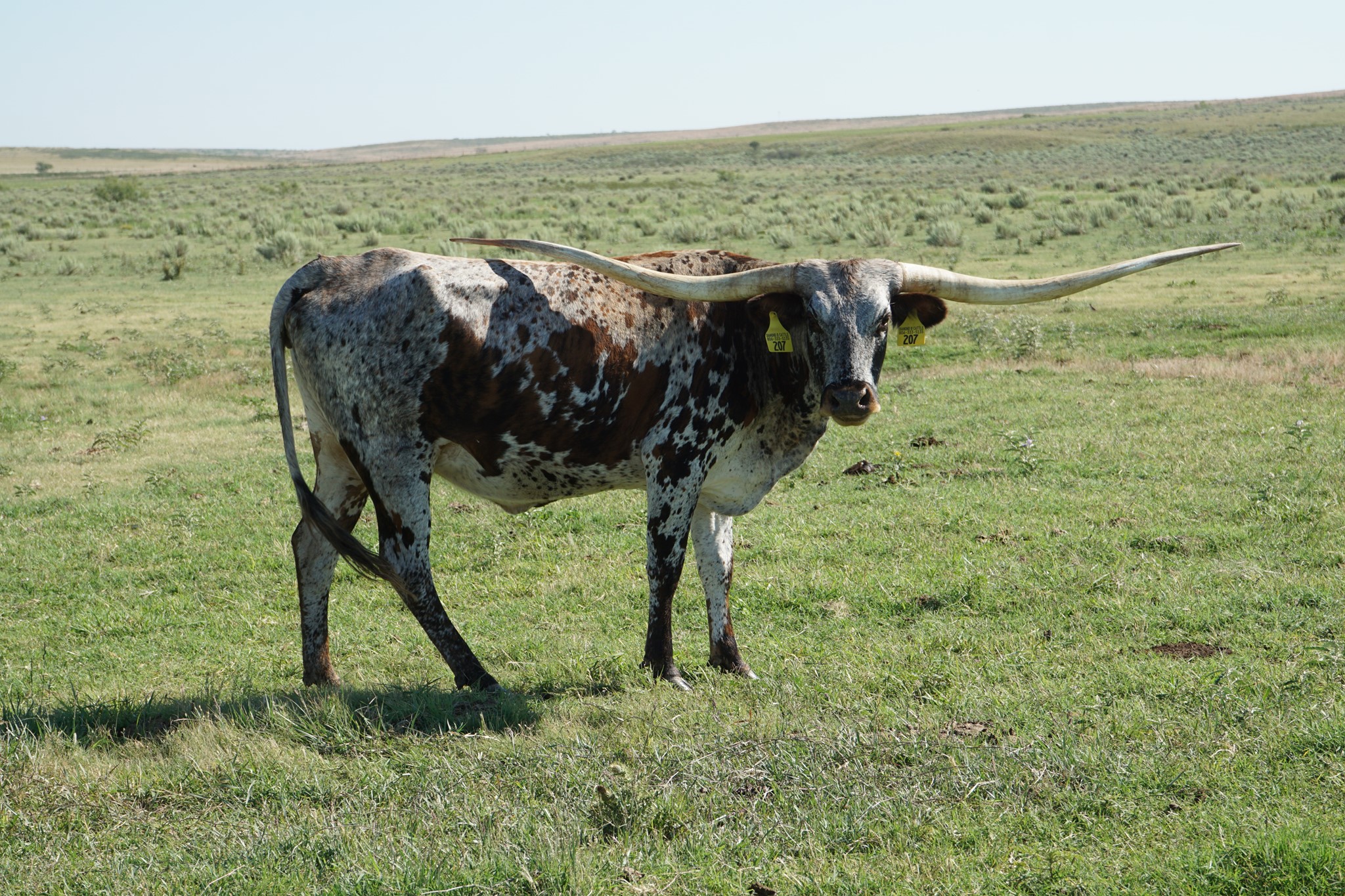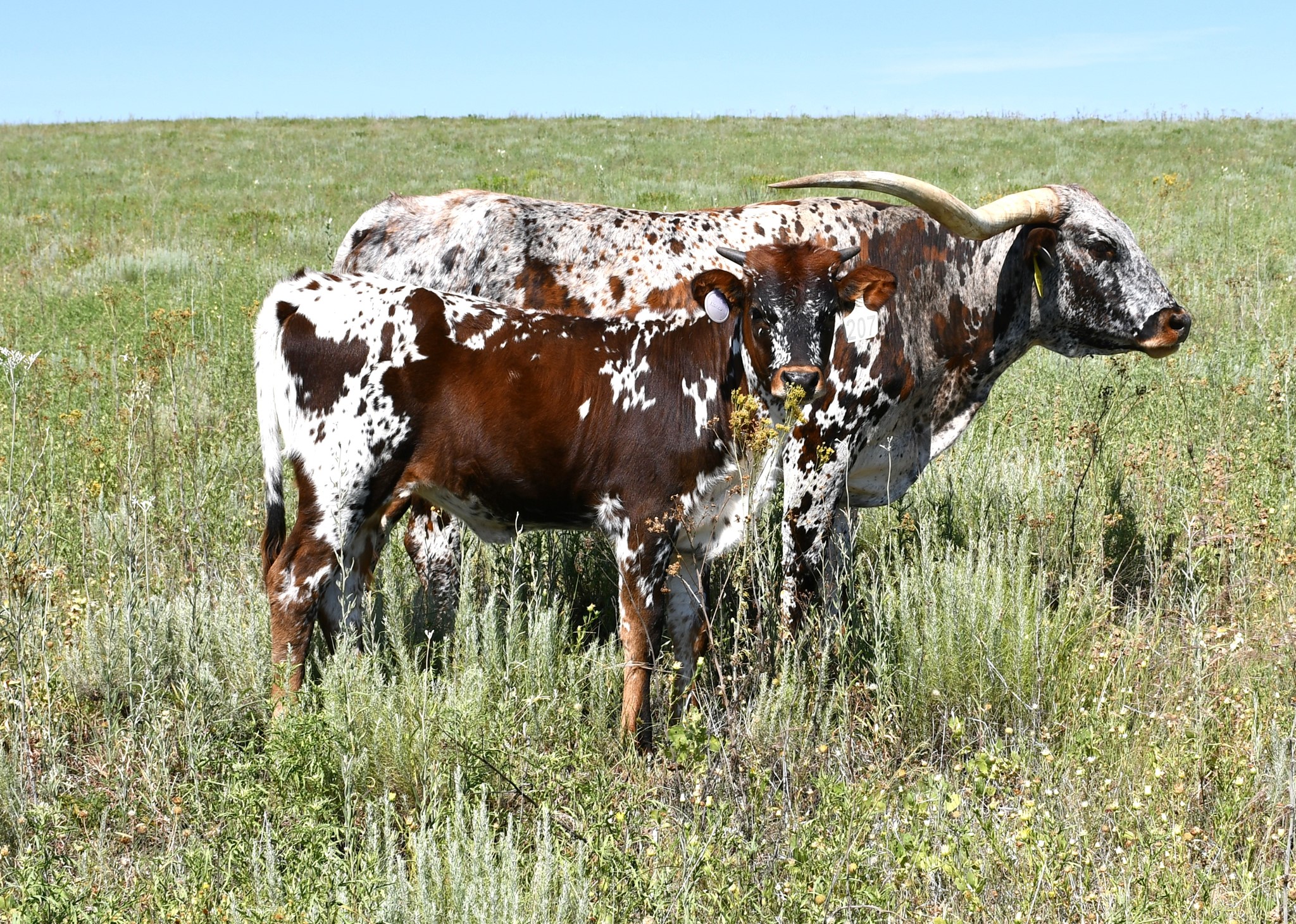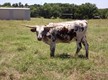 Great example of what Patton HB can produce, lateral twisting horns, a beautiful blue tri-color roan and passes the color to her offspring. She is safe in calf to the 106” T2T Kid Rock for a May/June 2024 calf.