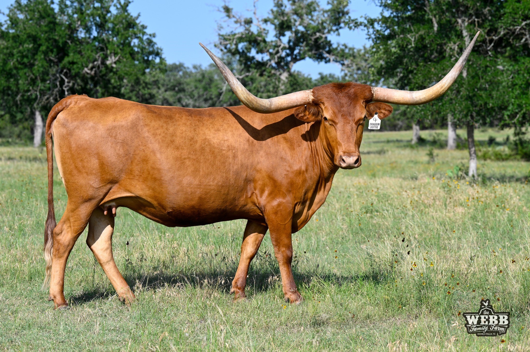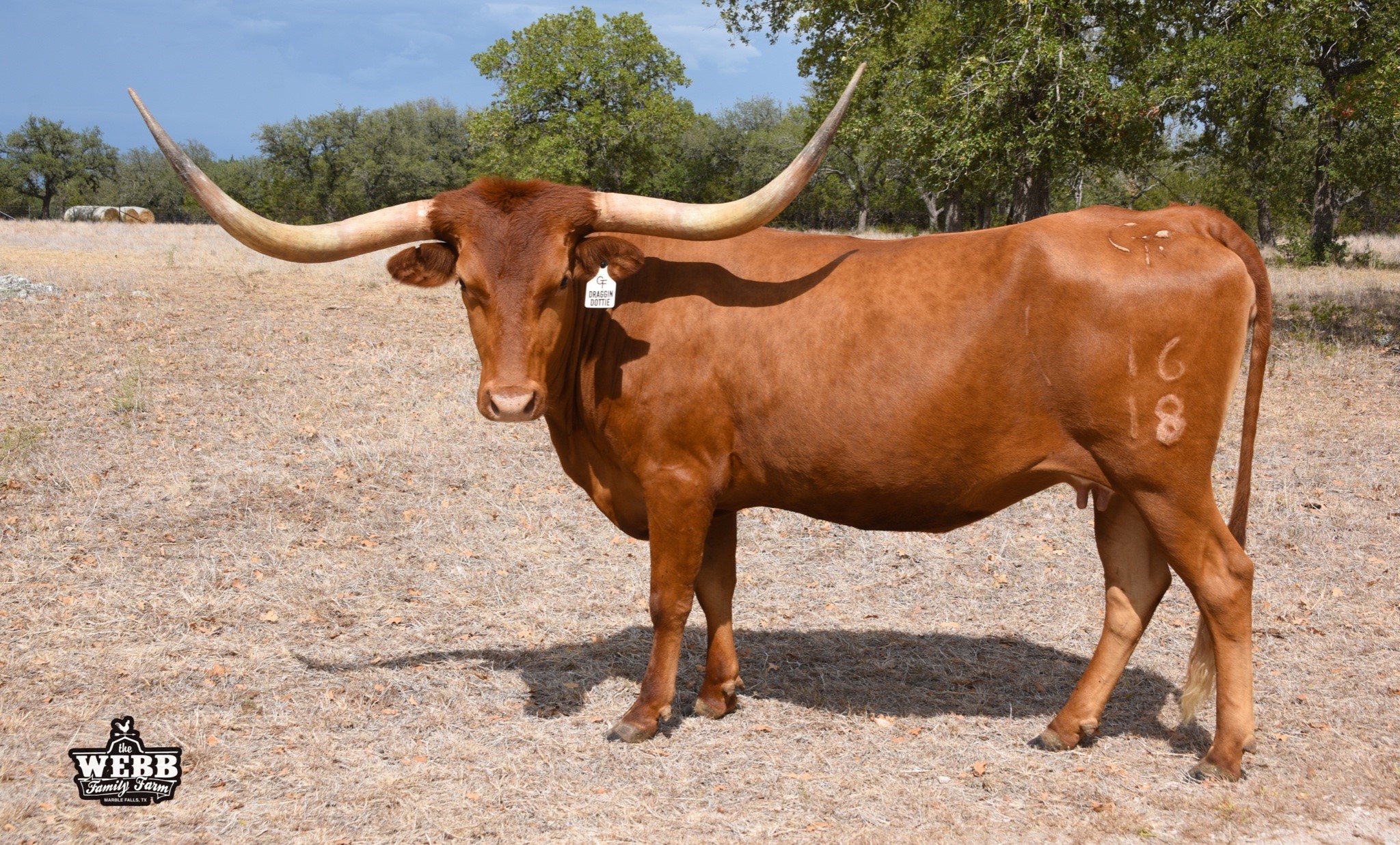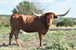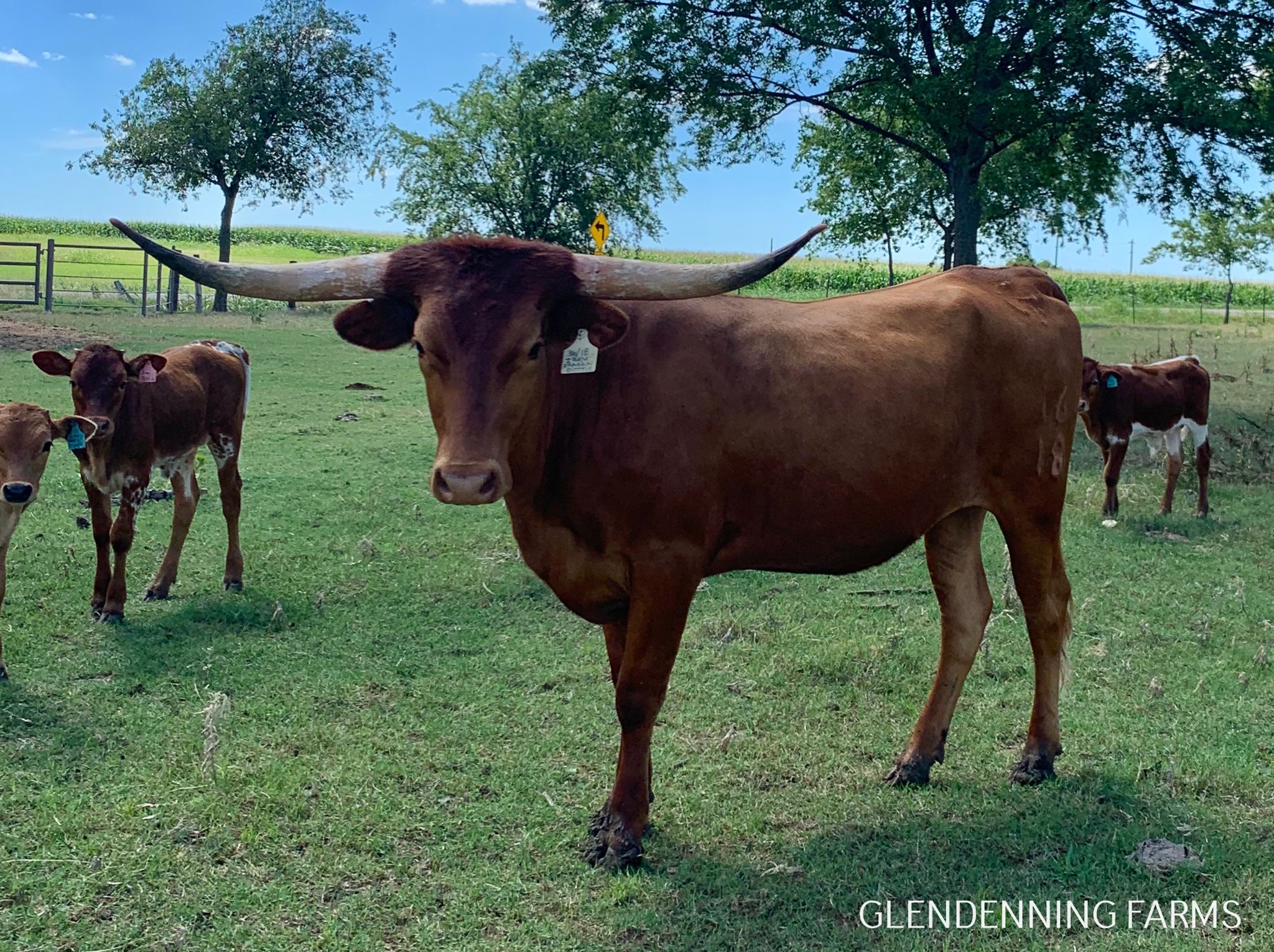 Big framed, long and tall, rust-red Drag Iron daughter with a ton of total horn, Iron Mike ST also in her pedigree. She is an excellent mother, perfect disposition, and she's blessed us with two gorgeous heifers, one we're keeping as a replacement. Check out her progeny, she may be red, but she throws flashy calves!